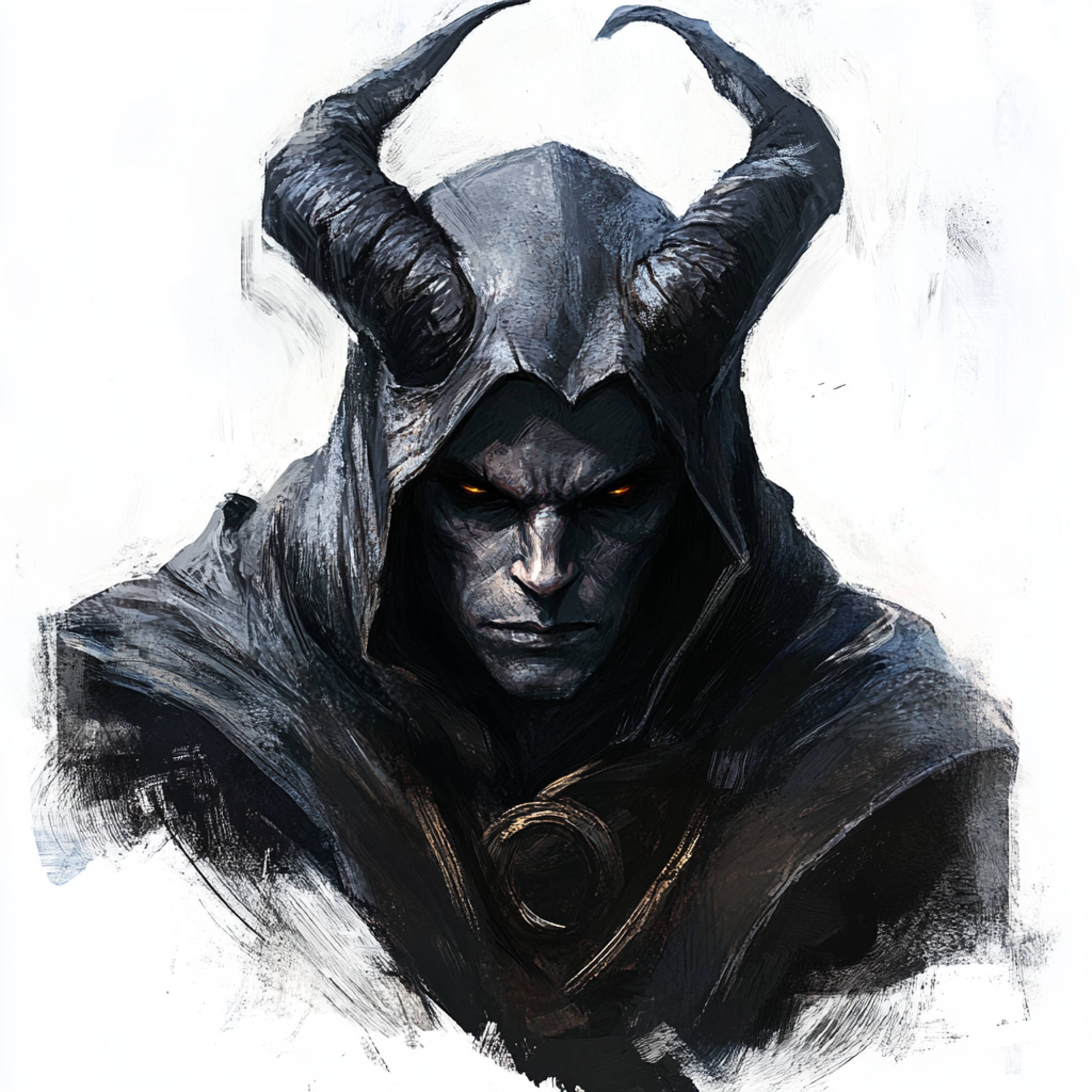 Grey-skinned Tiefling with sharp features, red eyes, and a black cloak. He bears a metal insignia around his neck, as well as the brand of Cattivu’s Will on his forearm.