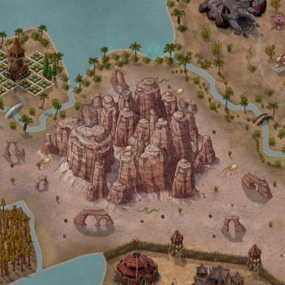 At the heart of the mesa lies a series of towering rock formations arranged in a natural maze, twisting and narrowing into tight corridors of stone. It is whispered that an ancient treasure lies hidden within, but few dare to seek it. The deeper one goes, the more dangerous the land becomes. Massive spiders lurk in the shadows of the rocks, venomous serpents coil beneath the sand, and at night, packs of direwolves prowl in eerie silence.