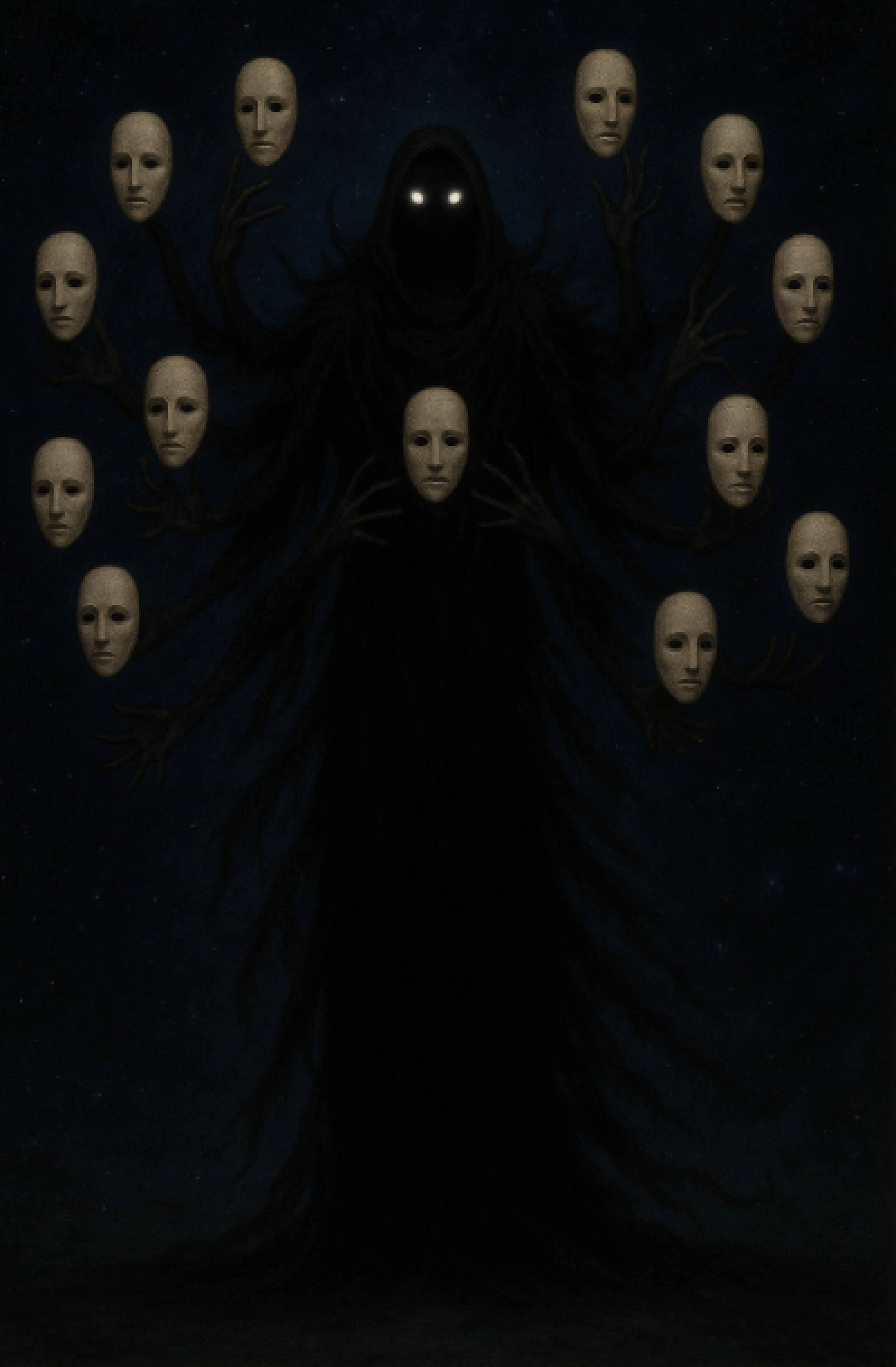 - You drift in a vast, endless darkness. When you glance down, your body is translucent, barely there, yet within you coil countless chains. They twist through your limbs, your chest, your very core, stretching beyond you in every direction. As you follow their paths, you slowly raise your eyes. Looming before you is a figure of shadow, its shape indistinct. Around it, hundreds of pale, featureless masks float, each tethered by writhing black tendrils that spread out like a web across the void. You realize with a jolt that four of your chains extend outward and fasten themselves to four of these masks. Suddenly, light bursts from within you, blinding, radiant, and surges down the chains. One by one, the masks flare, shifting, transforming into faces you know well. First Mewofi. Then Dadaka. Then Lionel. And finally… Thraine.